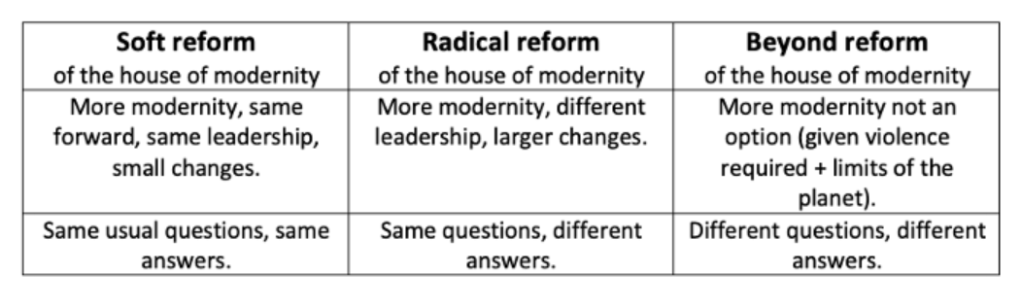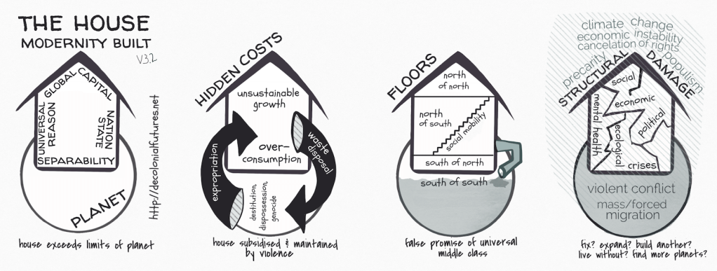 Our analysis was based on a critique of “modernity” that makes it visible how modernity is inseparable from the violences of colonialism, of how it has set us on a dangerous path of premature human extinction (mass extinction in slow motion) by promoting 4 denials: